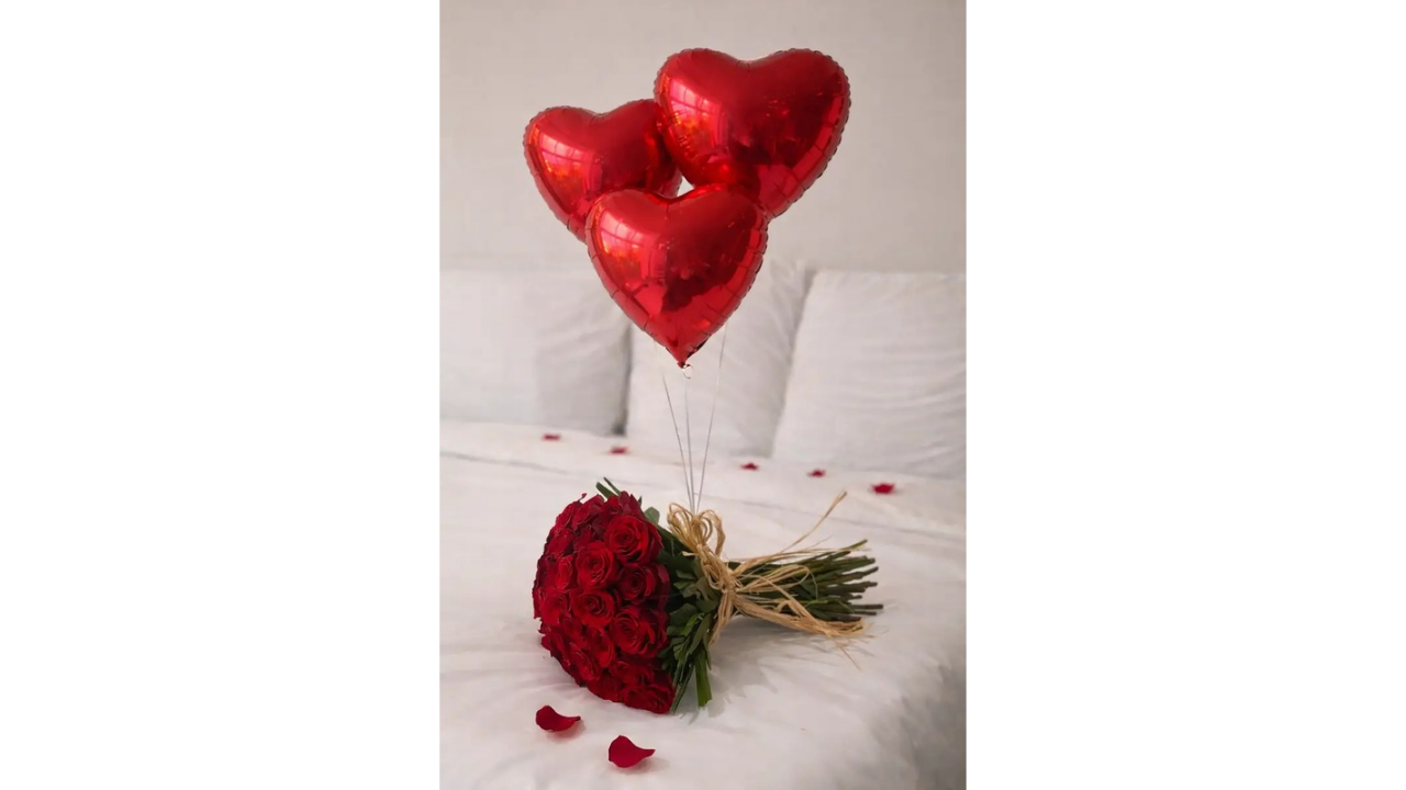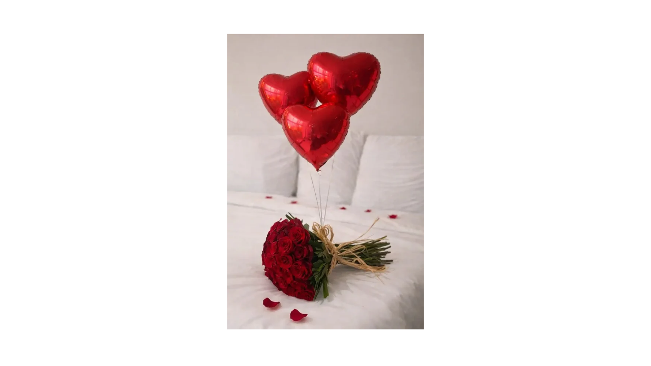 20 red roses with 3 heart-shaped balloons, elegantly arranged for romantic and special occasions.Perfect for anniversaries, birthdays, proposals, and special moments filled with love.
